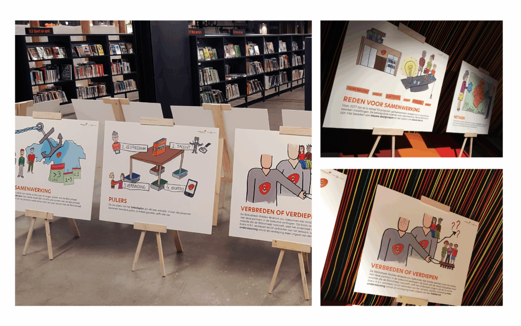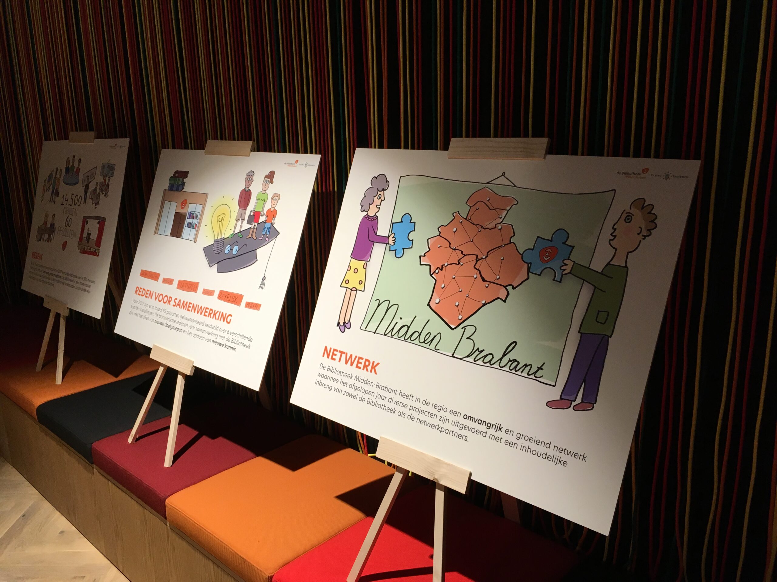 Visualisaties die het onderzoeksrapport van Tilburg University m.b.t. Bibliotheek Midden-Brabant verhelderen voor bezoekers. Expositie tijdens opening LocHal.